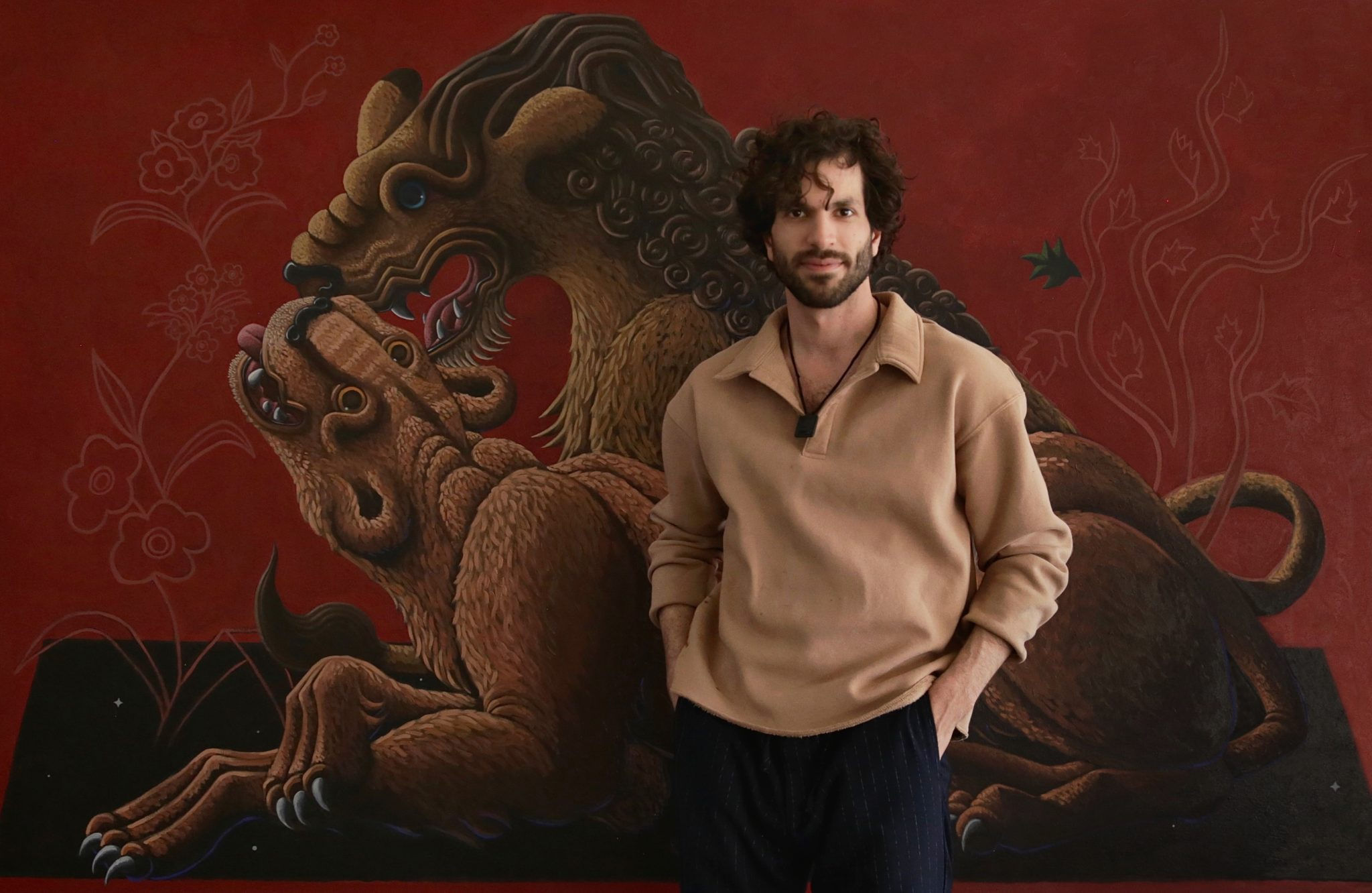 A fish in a cat-shaped fish bowl, a figure whose head is an actual cloud, a white fox howling (is it even a fox?), an upside-down balloon, a purple umbrella… Surreal is the abnormal, the unexpected—like unusually long limbs or a monkey on roller skates. I’m mesmerized by “Two Lovers”: two lions lying atop each other, teeth bared in a display of intense affection. Surrounded by a vivid tapestry of flowers and set against a backdrop of warm, moody hues—burgundys, browns and deep reds—the life-size painting captures the essence of wild romance and fervent love. The atmosphere, enriched by the color scheme, magnifies the passionate embrace, blending the fierceness of the natural world with the tenderness of the moment.