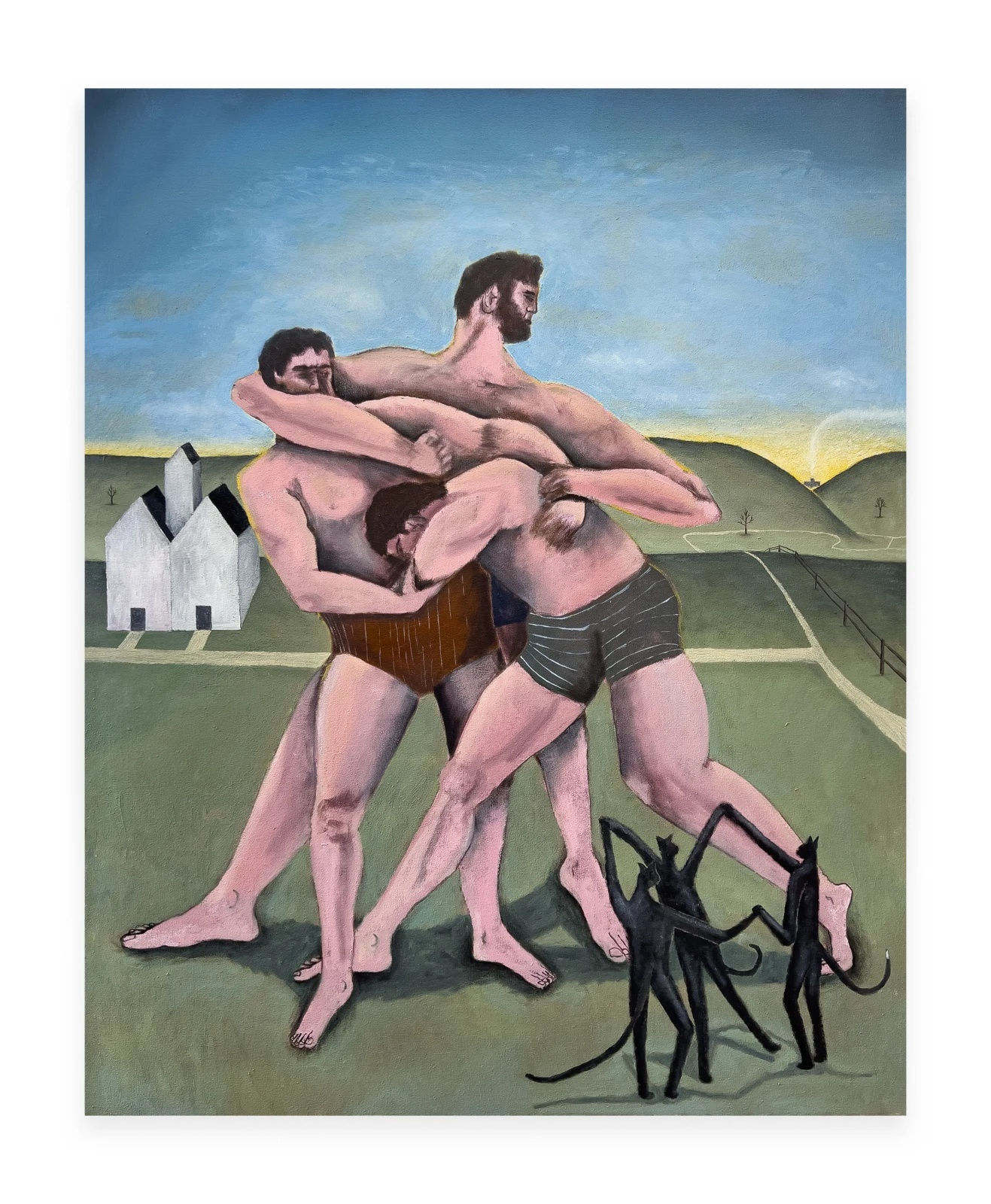 William Schaeuble, “The Schaeuble Brothers Wrestling,” 2024, oil on canvas, 40″ x 32″/Photo: Povos gallery