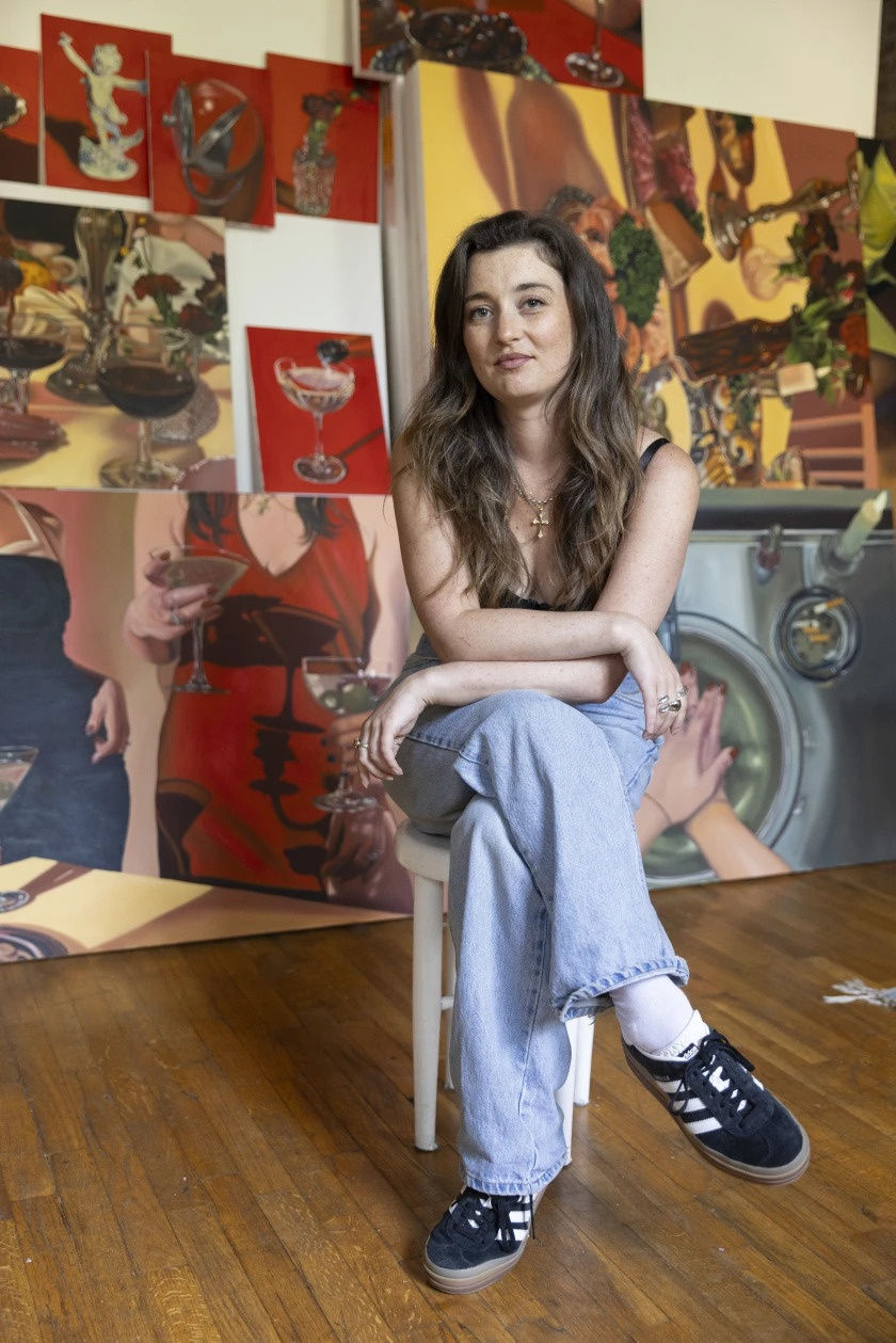 Mulgrew, who has 14 paintings in the show, had spent much of the year at the dinner table. Specifically, an intimate meal staged on a marigold yellow tablecloth decorated with burgundy flowers, flickering candles, and bowls filled with olives and cigarettes. The scene serves as Mulgrew’s central subject in a set of paintings that evoke a sensuous, martini-soaked evening. “It’s very inspired by my childhood, growing up around a lot of dinner parties,” reflects Mulgrew. “Moments of people coming together and human connection.”