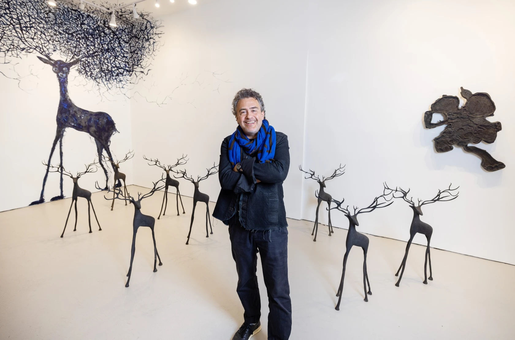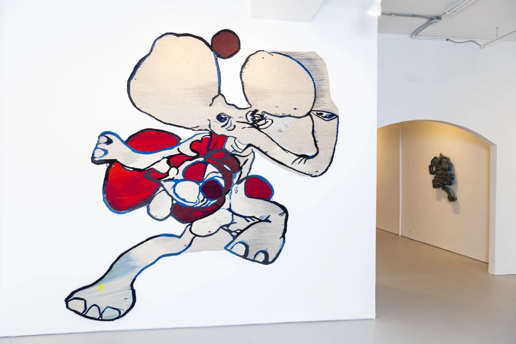 The exhibition at the West Town gallery space is filled with bronze sculptures made by Goût, along with four large tapestries (that take a full year to make) made of wool, dyed by fourth-generation weaver Antonio Ruíz Mendoza in Mexico. There are several oil and acrylic paintings and a video, and a homemade audio system spins a record specifically produced for the show.